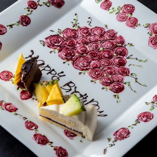 大切なお客様の思い出に残るよう、当店からサプライズサービスとして、メッセージ付き特製デザートプレートを1枚1500円でご用意いたします。誕生日、記念日、送別会などのお祝い事にぜひご利用ください。